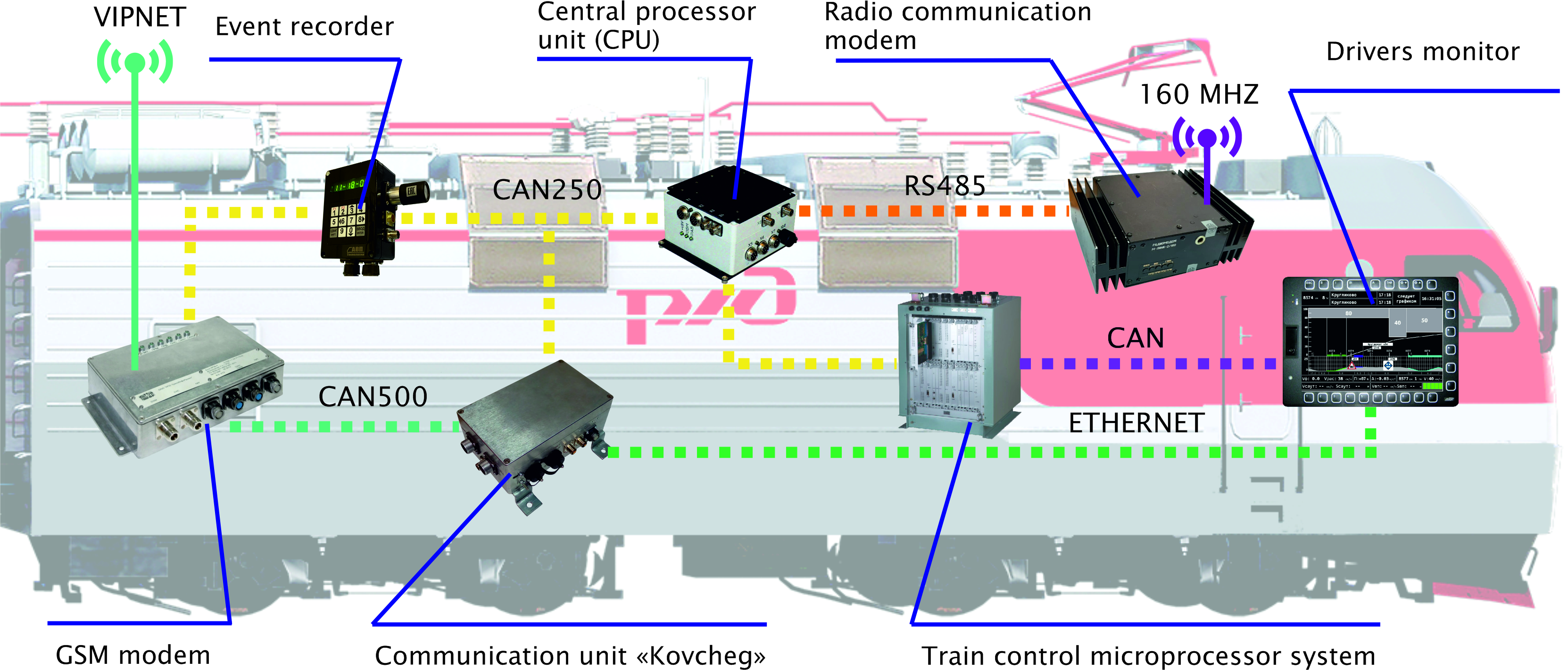 The drawing shows structure of ‘Virtual Coupling’ autopilot system for 3ES5K electric locomotive. System designed using modern hardware and software solutions and accepted by RZD.