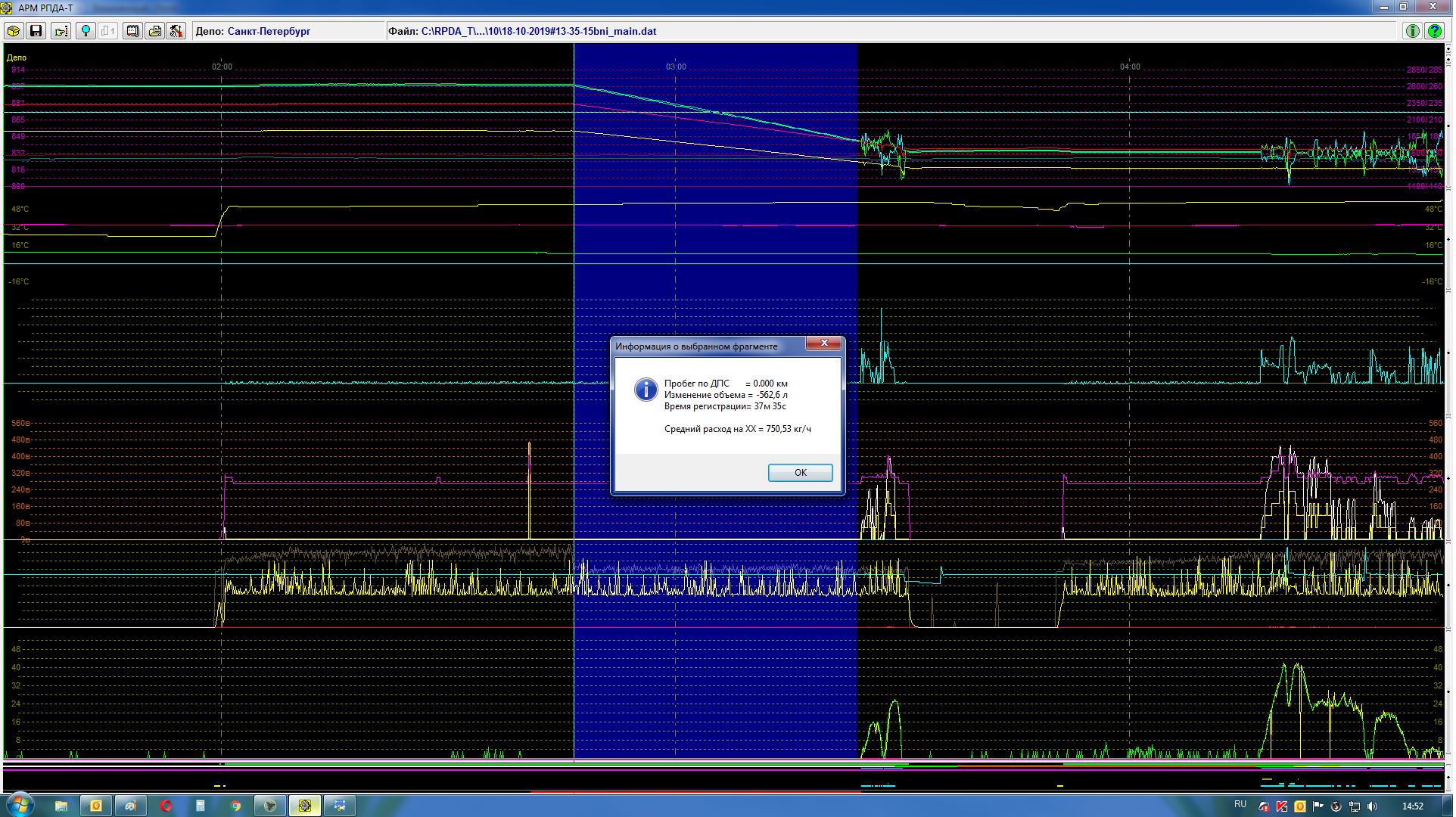 На рисунке представлен вид главного окна программы с обобщенными графическими данными о поездках, записанными на один картридж (полный режим). Расширенный режим включается/выключается в настройках АРМа.