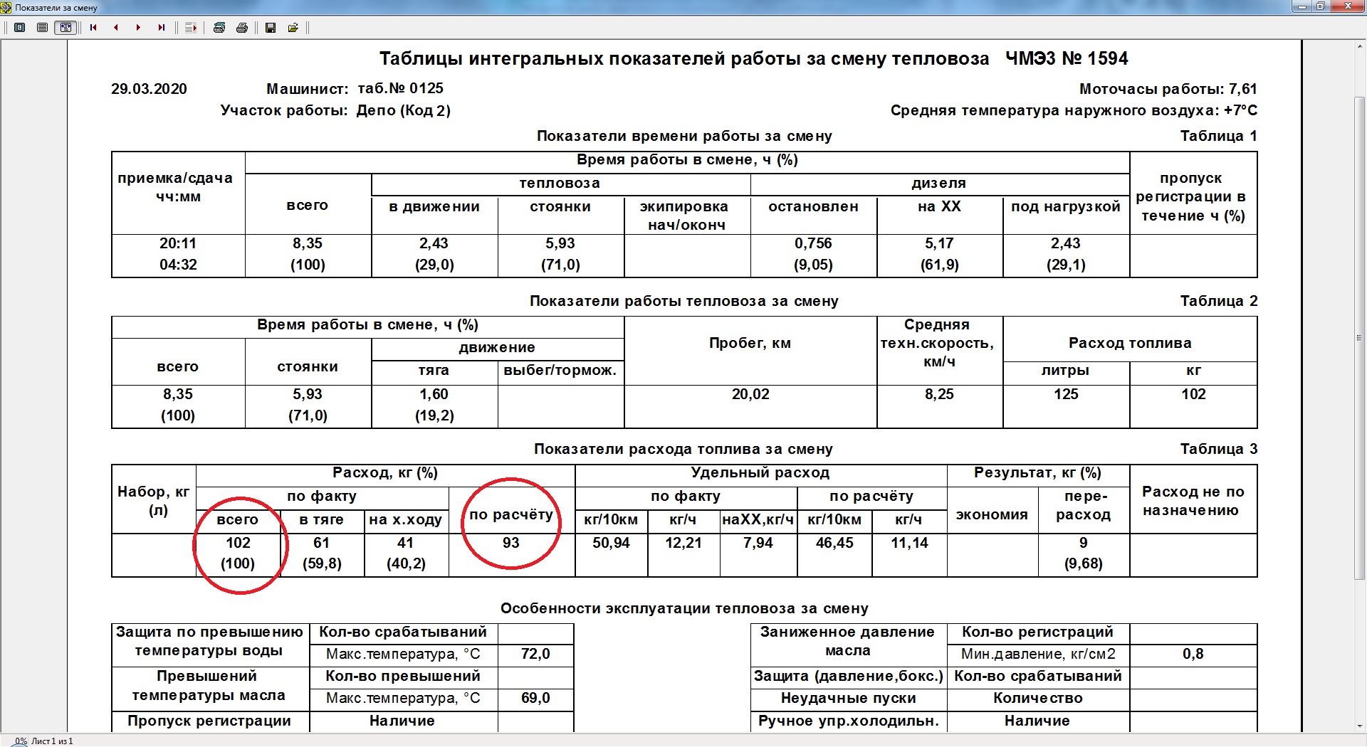В таблице «Показатели расхода топлива за смену» красным выделяется расход топлива не по назначению.