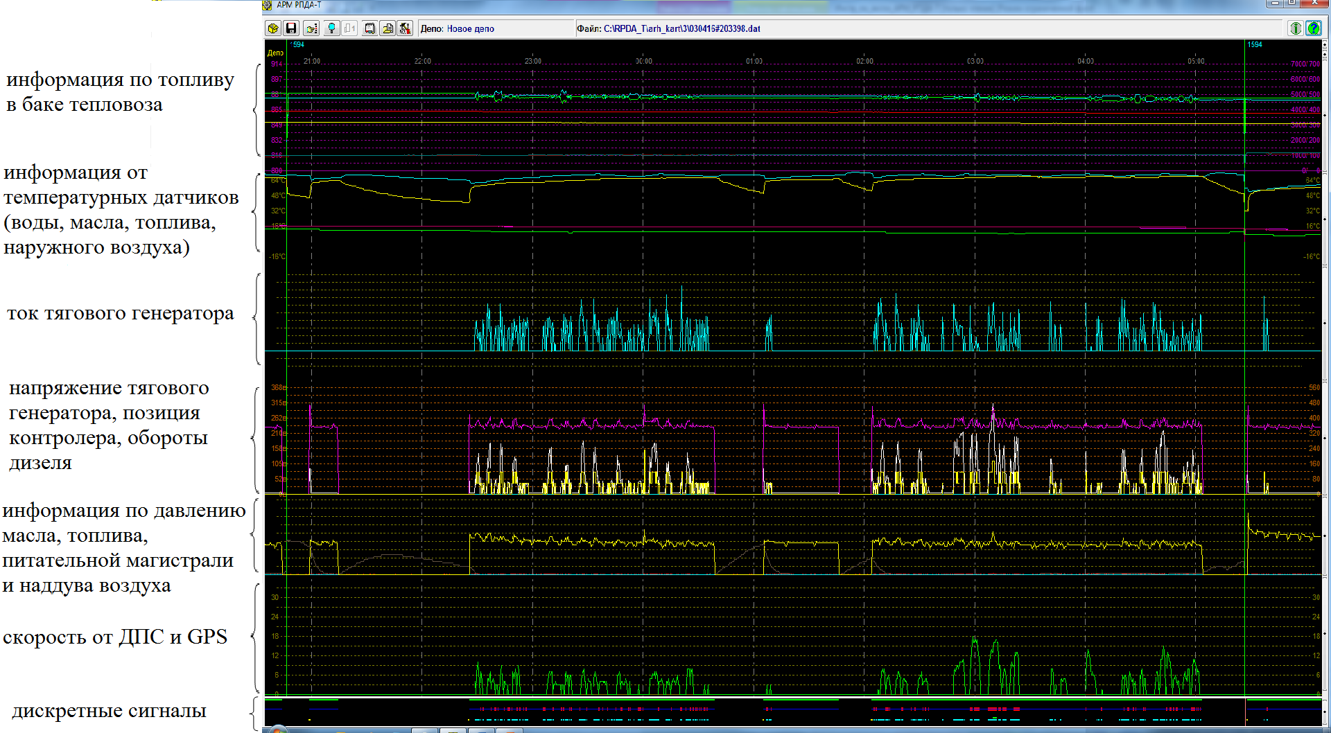 Расшифровка поездки на АРМ РПДА предоставляет данные о более 40 параметров работы локомотива. На электровозе в реальном времени фиксируется напряжение контактной сети, токи тяговых двигателей и общий ток электровоза, потребляемая энергия, давление в уравнительном резервуаре и тормозной магистрали, тормозных цилиндрах, скорость движения и местоположение поезда, максимальная скорость движения и внесенные машинистом поездопредупреждения, сигналы локомотивного светофора, срабатывания аппаратов защиты и боксования и т.д. На тепловозах допонительно регистрируются параметры работы дизель-генераторной установки.