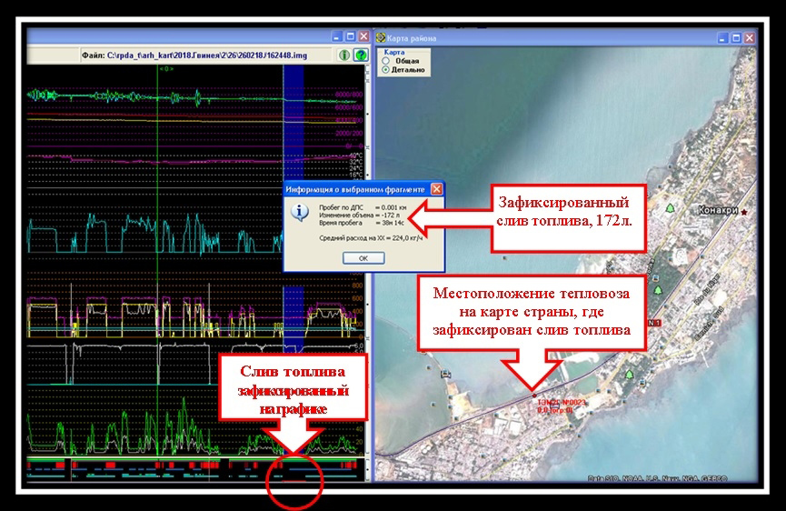 На графике выведен красным сигнал о расходе не по назначению, местоположение тепловоза в момент слива топлива и количество слитого топлива.