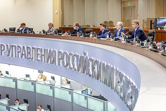 На площадке Главного центра управления Российскими железными дорогами 6 июля генеральный директор – председатель правления компании Олег Белозёров представил помощнику президента РФ Игорю Левитину (справа налево) и партнёрам возможности технологии «Виртуальная сцепка», внедрённой на двух участках Дальневосточной и Забайкальской дорог Восточного полигона.