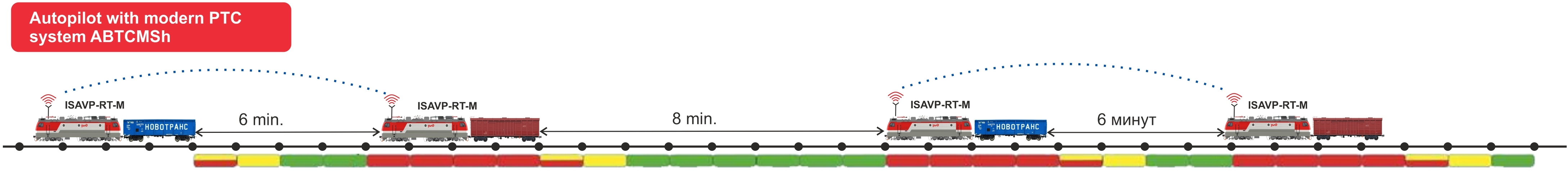 Current ‘Virtual Coupling’ autopilot driving technology provides 8 minutes trains interval on the mainlines equipped by PTC (signaling and safety) system.