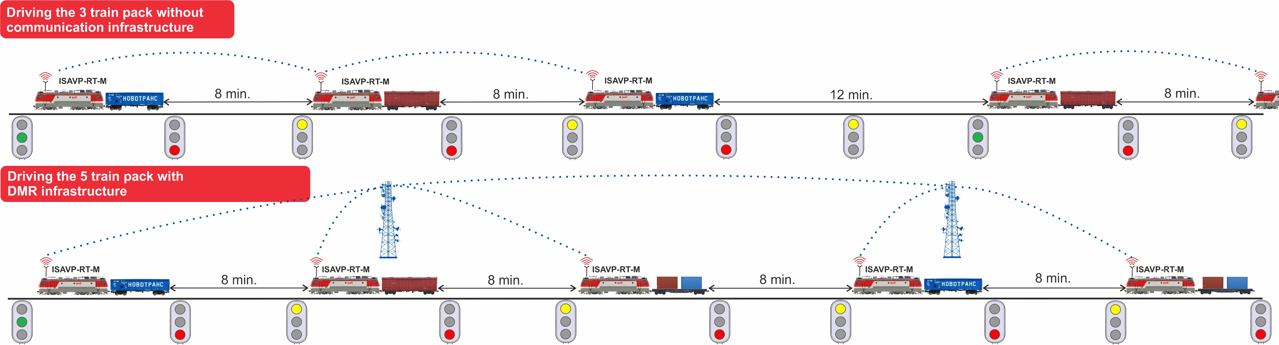 The obvious goal of ‘Virtual Coupling’ technology is to drive more trains as one unit or pack. The closest task is to drive pack of 3-5 Virtual Coupled trains with 8 minutes interval.