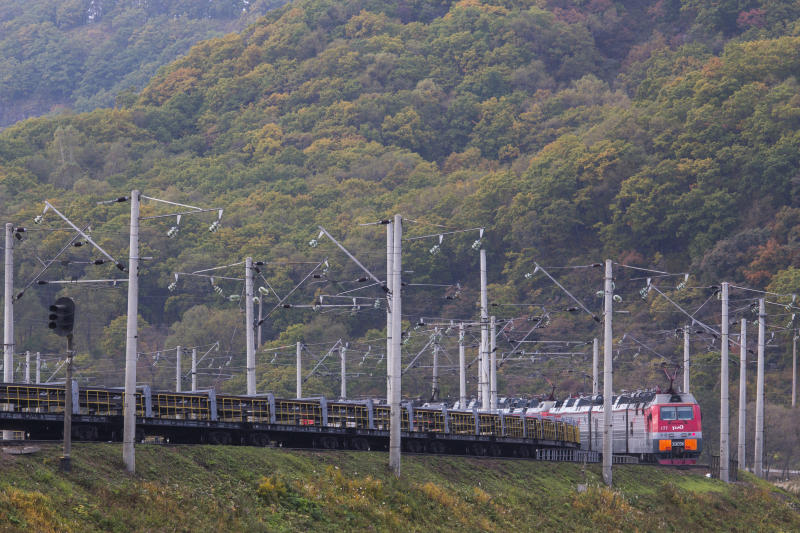 Состав из двух синхронно движущихся грузовых поездов с минимальным интервалом был отправлен со станции Ружино (Приморский край) в западном направлении.