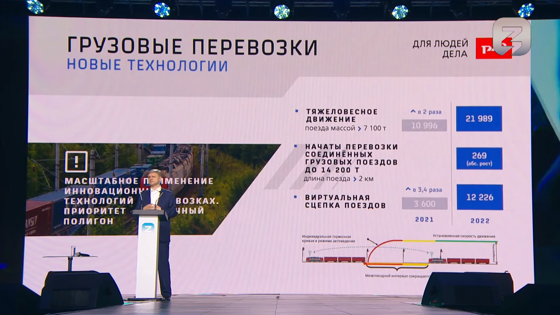 Также он обратил внимание, что в следующем году планируется транспортировать 180 млн тонн грузов на восток, и для осуществления перевозок настолько внушительных объемов необходимо применение современных технологий. Решением служит использование соединённых поездов длиной до 2 км, а для увеличения пропускной способности – активное применение «виртуальной сцепки».