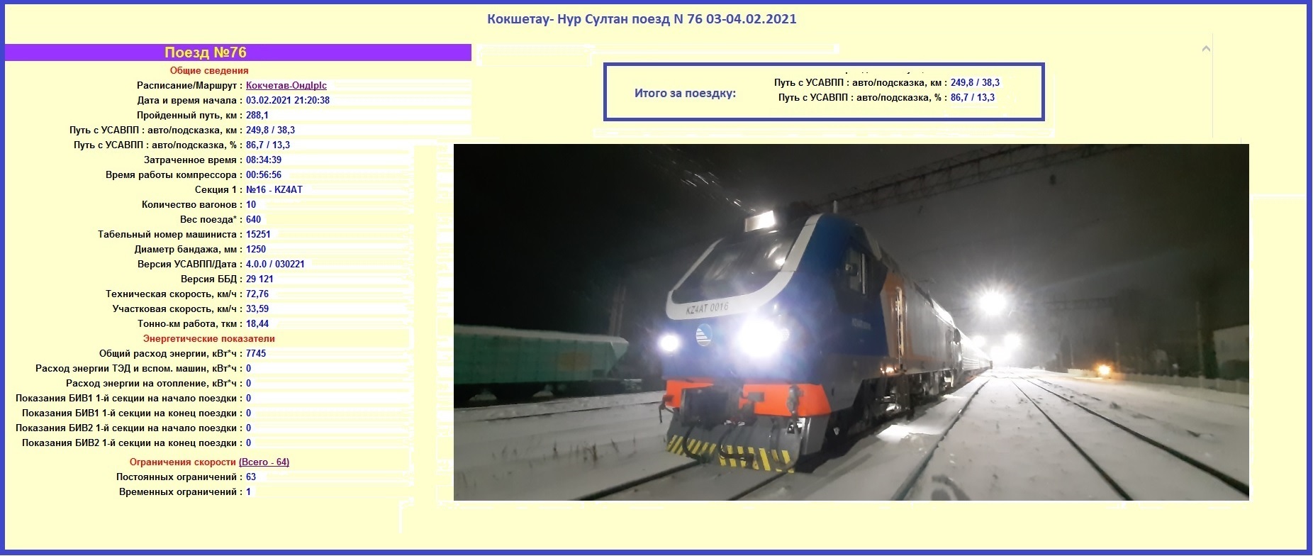 На участке Нур-Султан - Кокшетау специалистами ООО "АВП Технология", Alstom и АО "НК КТЖ" с 1 по 19 февраля 2021г. проводятся подконтрольные поездки на электровозе KZ4AT серии Prima для проверки совместной работы бортового ПО и ПO системы автоведения.