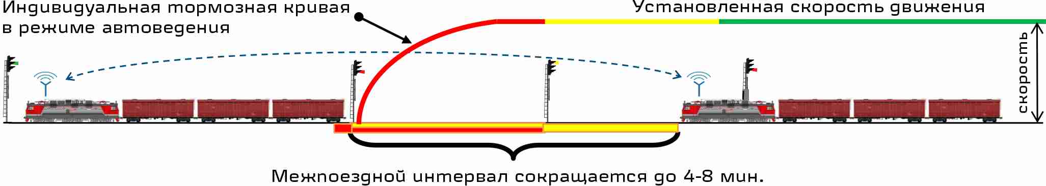 Модернизированная система УСАВП с установленной системой ИСАВП-РТ-М ведомого поезда, основываясь на информации, поступающей от ведущего поезда, производит расчет момента изменения сигнала огня локомотивного светофора с «желтого» на «зеленый» или с «красно-желтого» на «желтый», тем самым соблюдая наименьшее безопасное расстояние между ведущим и ведомым поездами без применения торможения, и не нарушая скоростей движения, установленных устройствами безопасности. Непрерывно производится расчет эффективности работы системы торможения, как своего состава, так и виртуально сопряженного, для расчета оптимальной траектории ведения поезда.