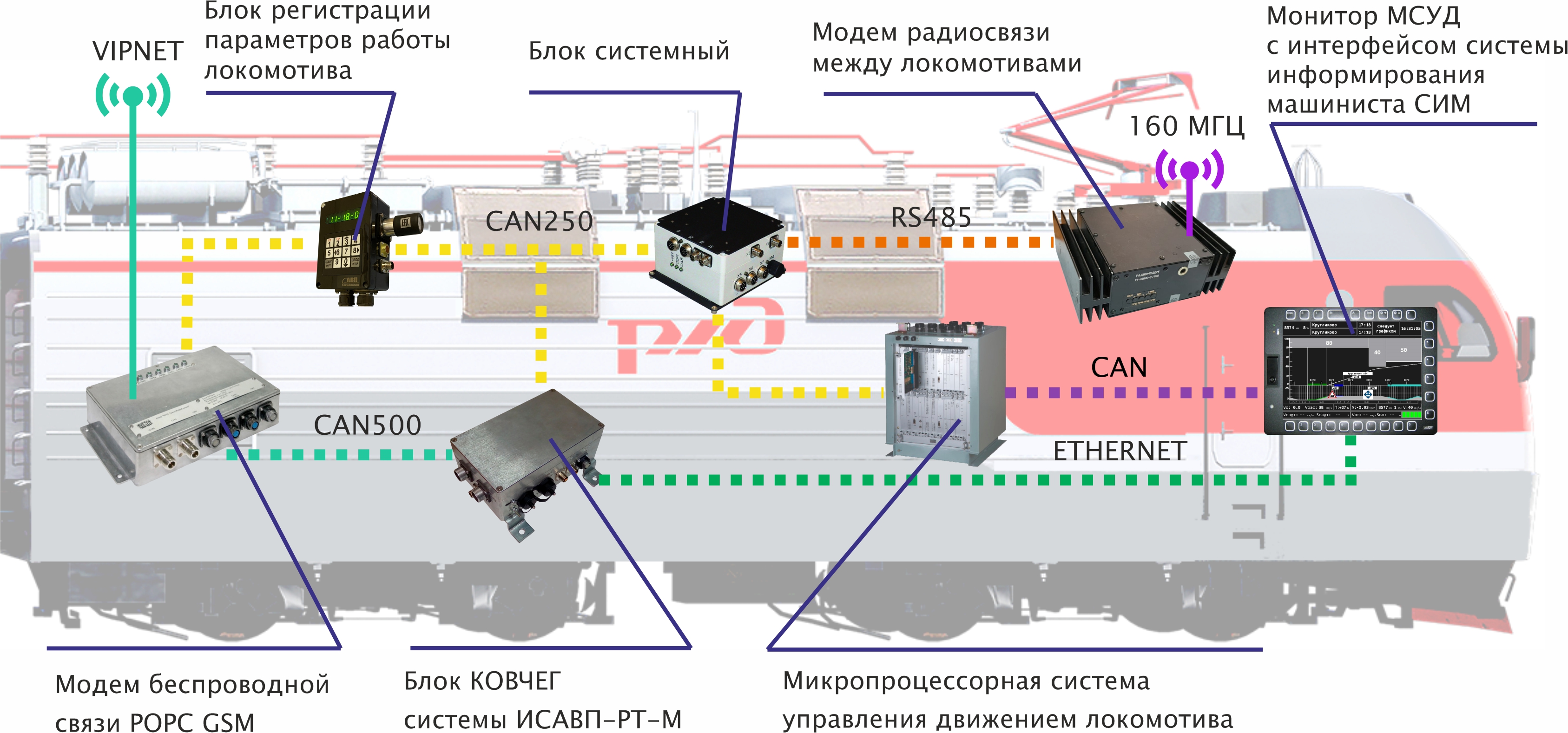 - прием диагностической и телеметрической информации о состоянии оборудования локомотива, МСУД, УСАВПГ, ИСАВП-РТ;