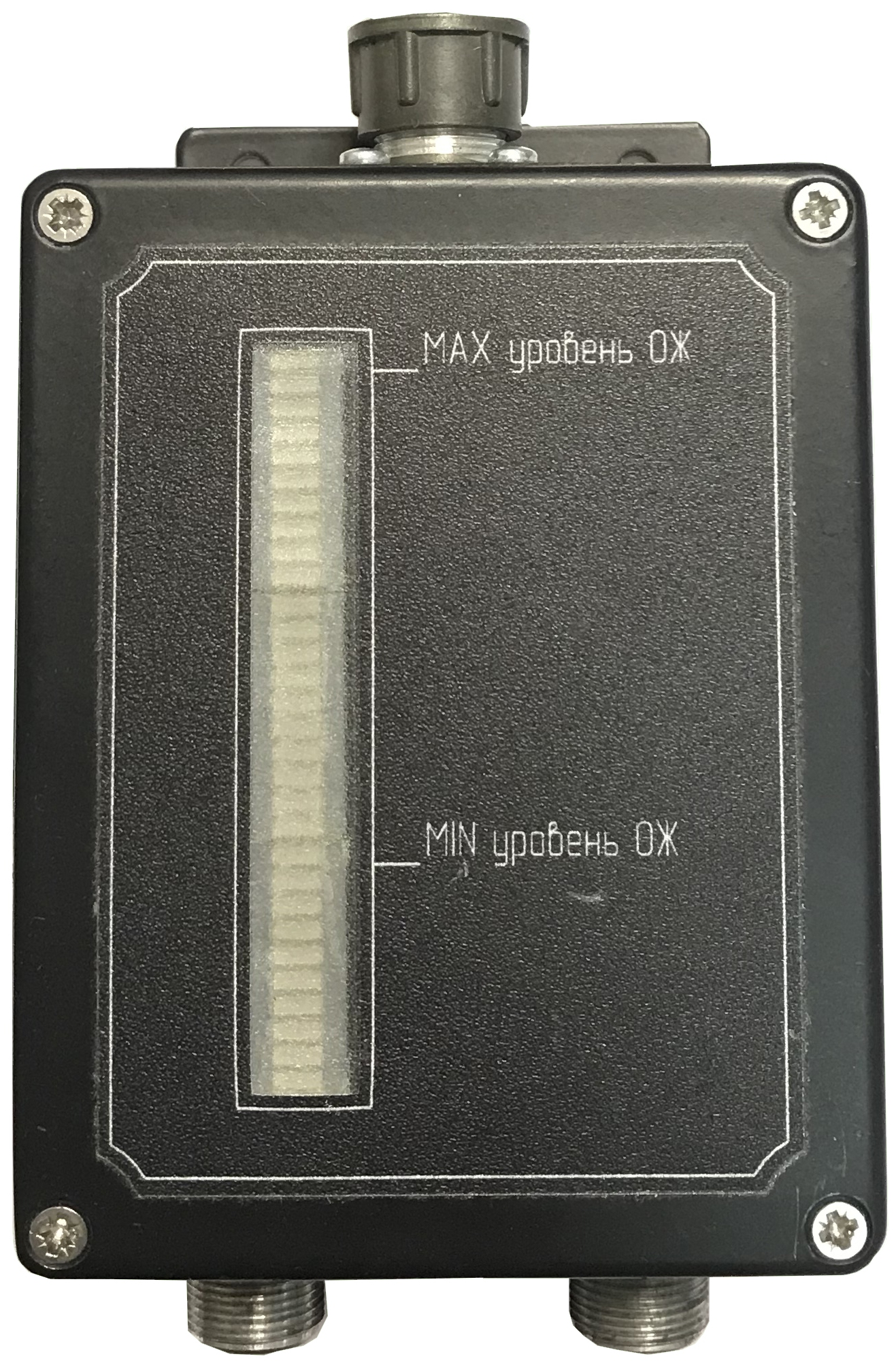 Индикатор охлаждающей жидкости (ОЖ) предназначен для оперативного контроля уровня ОЖ в жидкостных системах охлаждения двигателей внутреннего сгорания подвижного состава железных дорог с выдачей информации об уровне ОЖ по цифровому интерфейсу (CAN-шина), а также формирования дискретного сигнала (сухой контакт встроенного реле) при падении уровня ОЖ до минимального значения. Индикатор ОЖ включает в себя преобразователь питания бортовой сети, индикатор в виде светодиодной линейной шкалы, преобразователь данных, переданных по CAN-интерфейсу с датчика индикатора ОЖ, разъем питания от бортовой сети и выхода с нормально-разомкнутых контактов (сухой контакт) встроенного реле, разъем питания датчика индикатора ОЖ и CAN шины, разъем для передачи информации по CAN шине в другие системы. Индикатор устанавливается в кабине машиниста или машинном отделении для визуального контроля уровня ОЖ и связан по CAN шине с датчиком индикатора ОЖ и другими системами. Подключение к цепям питания осуществляется посредством соединителя «Х2», к датчику индикатора ОЖ «Х1», к шине CAN «Х3». |
