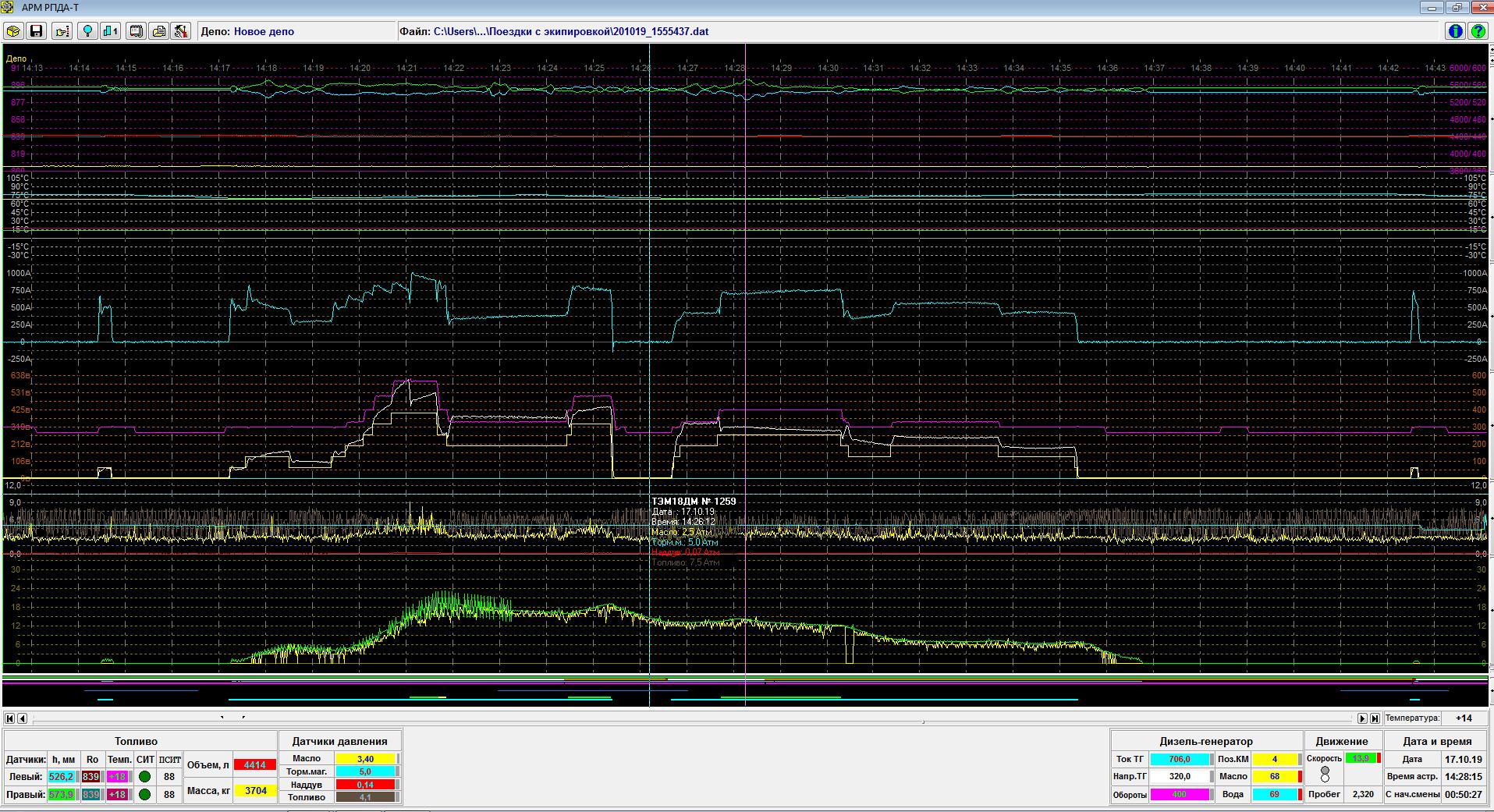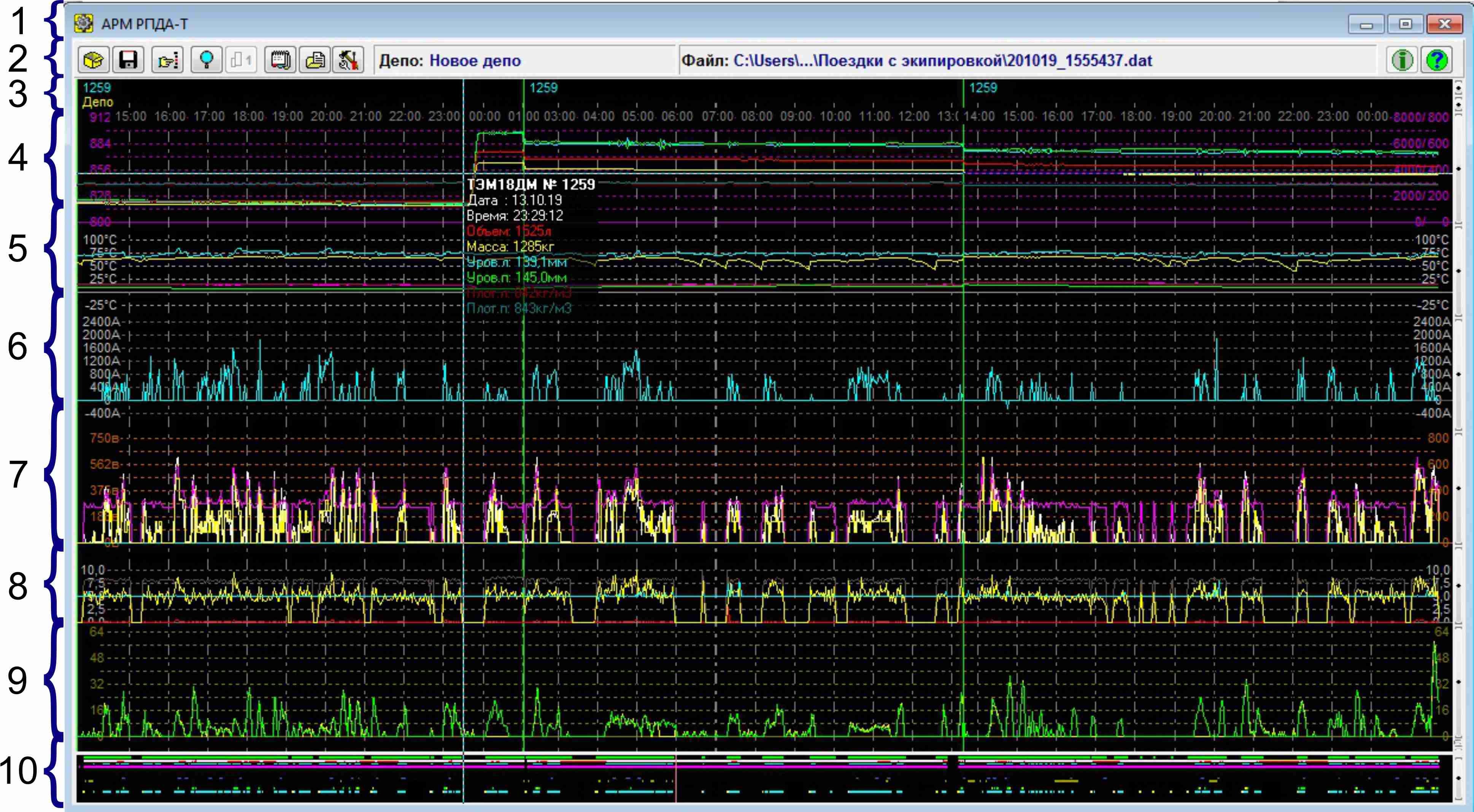 На рисунке представлен вид главного окна программы с обобщенными графическими данными о поездках, записанными на один картридж (полный режим). Расширенный режим включается/выключается в настройках АРМа.