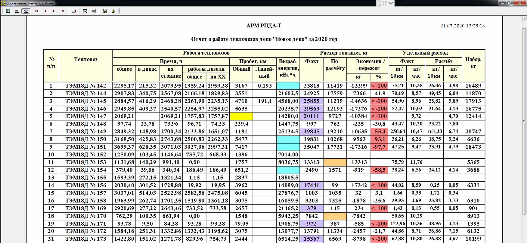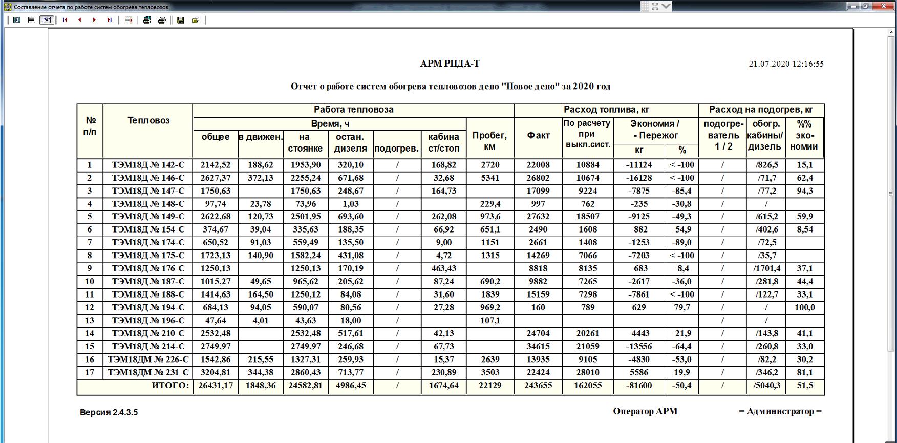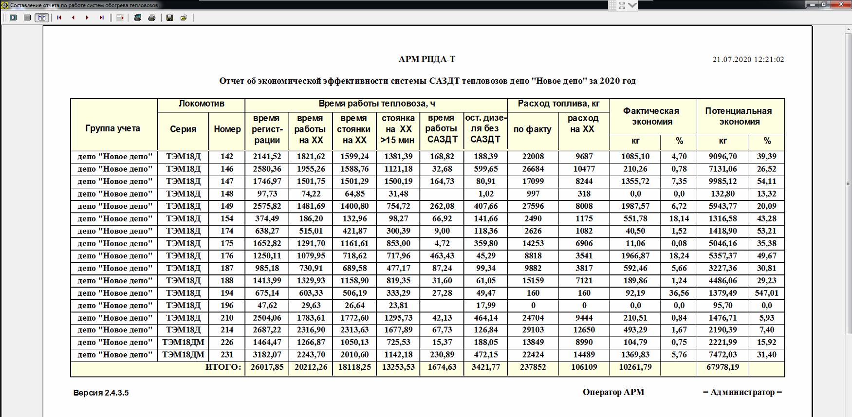 Отчет об экономической эффективности системы САЗДТ тепловозов включает в себя сведения из базы данных за выбранный период времени (день, месяц, год или произвольный интервал времени).