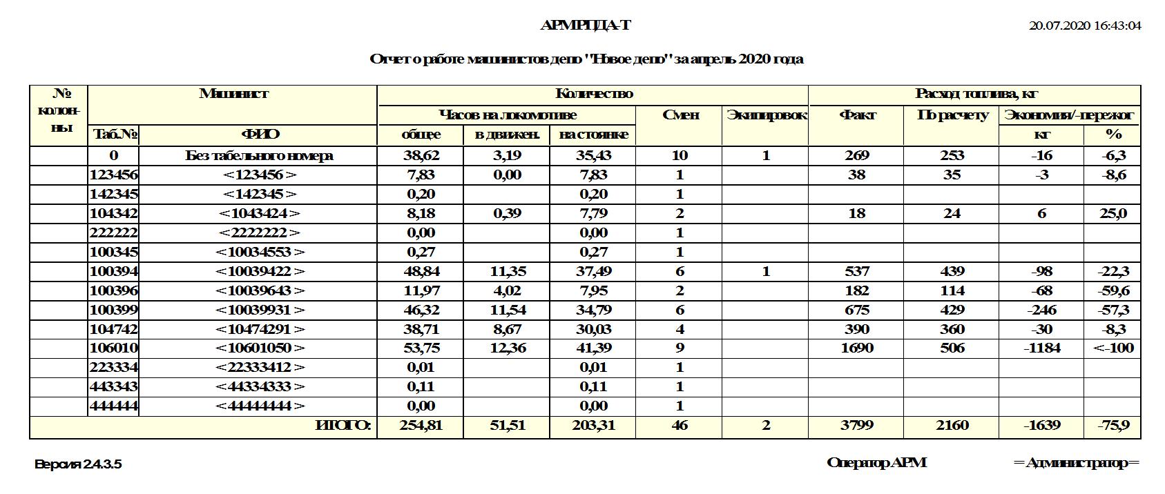 Отчет по работе машинистов включает в себя сведения из базы данных за выбранный период времени. Можно сформировать отчет обо всех машинистах, по колоннам либо индивидуально.