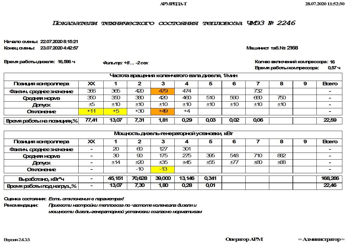 При применении технологии отслеживания технического состояния тепловозов по данным расшифровок АРМ РПДА и своевременной постановки на реостатные испытания и внеплановые ТО дополнительное сокращение расхода дизельного топлива оценочно достигает 400 тонн в год.